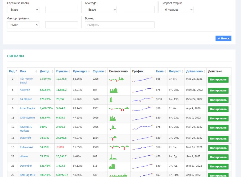 После прохождения регистрации следует ознакомится с самими Сигналами которые предоставлены в виде таблицы на сайте