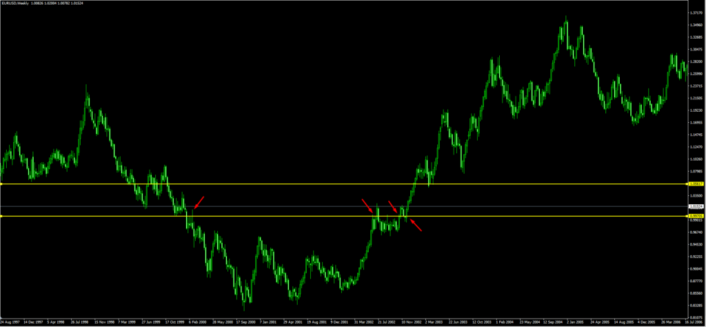 Теперь следует найти важный уровень ниже цены (уровень сопротивления) — для этого пролистаем график влево и уменьшим в размере, так как на отрезке с 2014 года нету данных. Пролистав график находим зону с 1999-2003 год где цена проводила больше все времени (из.2)