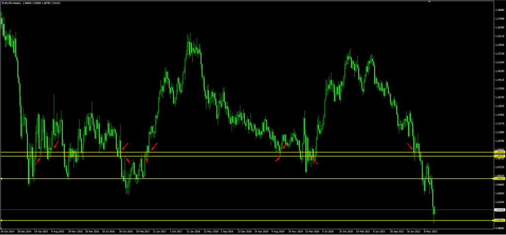 Построение происходит именно на недельном тайм фрейме. Как видно на скриншоте ниже (из.1), построен наиболее важный уровень выше цены(уровень сопротивления), образованный большим скоплением закрытий цен около этой зоны.