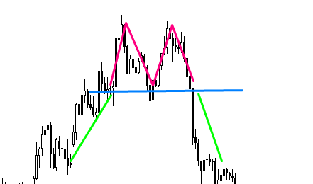 - «Двойная вершина» — разворотный паттерн, образующийся из двух поочередных вершин через их минимумы проводят линию основания, это поддержка. Преодоление этой черты сигнализирует о том, что пора продавать. Чтобы просчитать отработку, необходимо рассчитать среднюю высоту вершин.