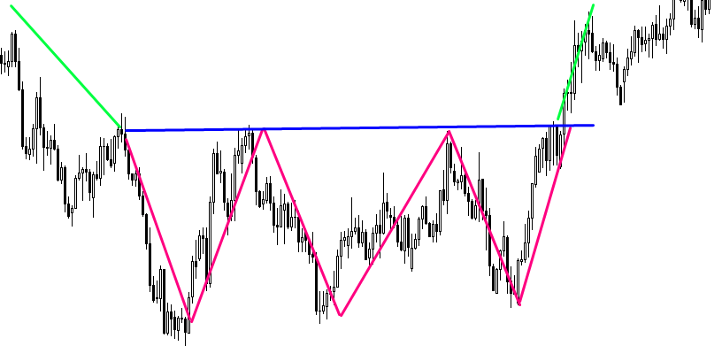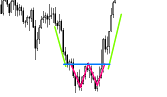 - «Двойное дно» схоже по своей сути с вышеописанной фигурой. Паттерн формируется в ходе падения цены, на её локальном минимуме. Данная фигура представляет собой две расположенные рядом друг с другом впадины. Через максимум прочерчиваем линию, это и будет уровень сопротивления. Покупки совершают после пробития черты. Цена должна подняться на величину, соответствующую высоте торгового паттерна.