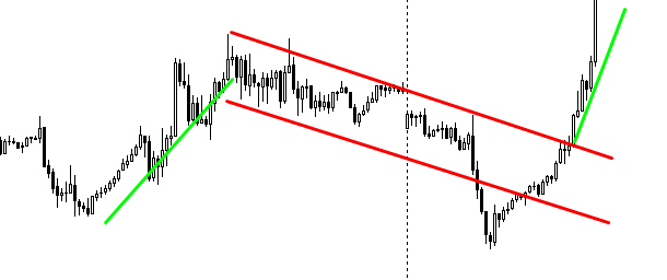 - «Флаг» продолжает действующий тренд, обычно его можно заметить после значительного движения. «Полотнище» представляет собой зону ценовой коррекции, после её завершения и пробития верхней границы целесообразно делать покупки.