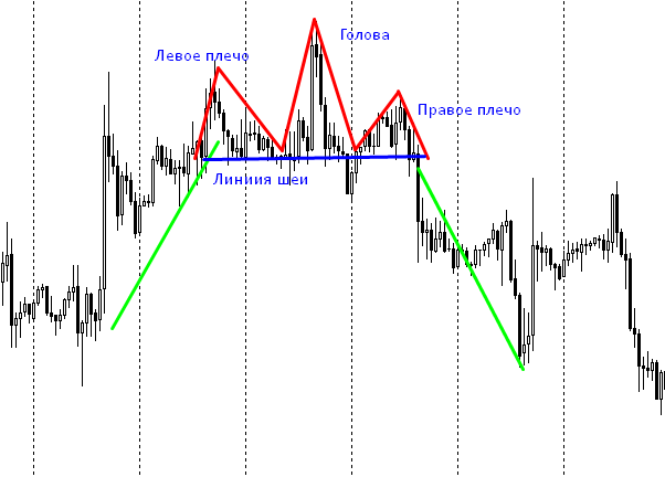 Паттерн «Голова и плечи»(сокращённо ГИП) считается разворотным, обычно он образуется при подходе цены снизу вверх к сильному уровню. Фигура состоит из трех вершин- левое плечо, голова, правое плечо. Цена подходит к уровню три раза, голова значит что покупатели приложили максимальные усилия для пробития уровня, когда в третий раз покупатели делают попытку пробить уровень, и закрытие цен происходит ниже уровня головы ниже, тогда трейдерам становиться понятно что они ошибались, цена начинает падать- так формируется правое плечо. Когда фигура полностью завершена, с высокой долей вероятности цена начнёт падать, так как трейдеры которые покупали, начинают закрывать свои позиции, остальных выносит по стопам, что усиливает движение цены. И хотя паттерн достаточно сильный и хорошо отрабатывается, следует его торговать с осторожностью так как он является разворотным.
