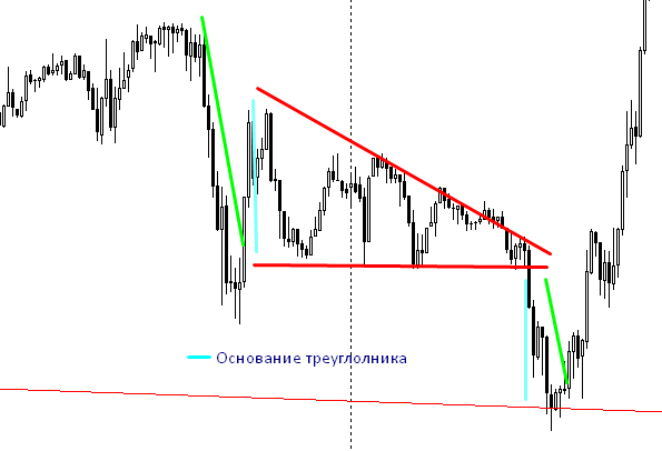 - Ещё одна фигура, свидетельствующая о продолжении движения вниз, — «Нисходящий треугольник». Здесь горизонтальным является уровень поддержки. Цена, закрывшаяся ниже нижней черты, сигнализирует о благоприятном моменте для начала продаж. Ожидается, что цена должна опуститься на величину основания «Треугольника», это же касается и Восходящего треугольника