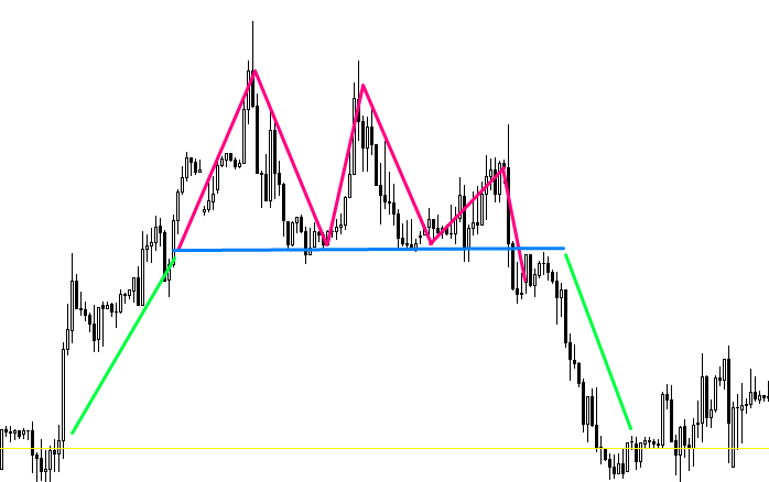 - «Тройная вершина» включает в себя три поочерёдных «холма», расположенных на одном уровне. Чтобы получить основание, соединяют два ценовых минимума, оно может обладать незначительным наклоном. Модель по смыслу очень похожа на ГиП. В примере на картинке показана хорошая ситуация когда третья волна покупателей смотриться слабо по отношению к двум предыдущим- это хороший сигнал на продажу.